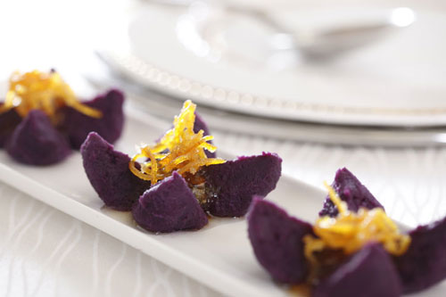 ??? 是天下一品中餐廳最受女性喜愛的一道菜肴。是用紫薯泥精制而成。紫薯富含硒和花青素,能夠抗癌防老化,頗具美容功效。