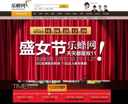 ????樂蜂網(wǎng)“盛女”節(jié)活動(dòng)將從11月1日啟動(dòng),擁有豐富的促銷機(jī)制,活動(dòng)周期長達(dá)一個(gè)月之久,而且每周重磅推出一個(gè)促銷主題 —— 全場5折、買1送1、滿200減100、10大品牌滿200送200。11月10日——11日光棍節(jié)期間,還將開啟48小時(shí)限時(shí)搶購活動(dòng)。面對樂蜂網(wǎng)的超低折扣,筆者不禁感嘆:今年雙十一,樂蜂網(wǎng)“脫光”了,“盛女”樂瘋了!