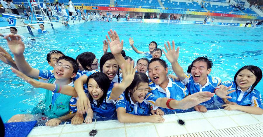 2008年9月15日,北京殘奧會游泳比賽在“水立方”落下帷幕,志愿者跳入水中慶祝。從2008年7月1日奧運志愿者開始陸續(xù)上崗服務至10月5日服務“十一黃金周”活動結束,170萬奧運志愿者的服務時間累計超過2億小時。10萬賽會志愿者在近80個業(yè)務領域的3000余個工作崗位上提供志愿服務,為各項賽事的成功舉辦提供了全面保障。中國青年志愿者協(xié)會多年來在扶貧開發(fā)、助老扶幼、社區(qū)建設、環(huán)境