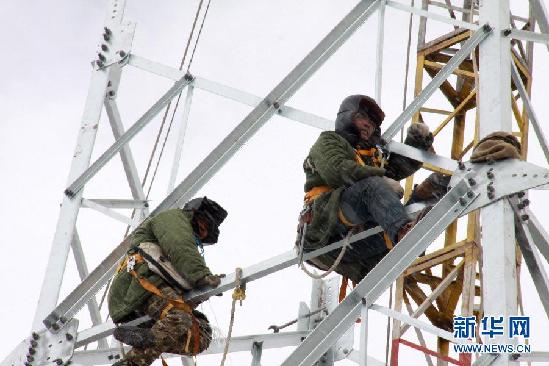 在海拔4800多米的巴顏喀拉山南麓,玉樹與青海主網(wǎng)330千伏聯(lián)網(wǎng)工程施工人員冒著嚴寒與缺氧加緊施工(10月27日攝)。目前,作為國家玉樹災(zāi)后重建重點項目之一的玉樹與青海主網(wǎng)330千伏聯(lián)網(wǎng)工程正加緊建設(shè)。該工程貫穿玉樹、果洛、海南三個藏族自治州,線路全長800多公里,其中海拔4000米以上線路482公里。工程總投資超過24億元,預(yù)計于2013年6月投入運行,建成后將從根本上解決玉樹地區(qū)缺電