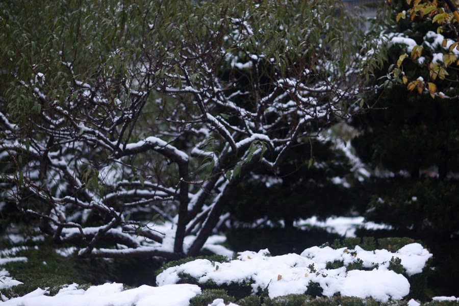 10月4日凌晨,北京迎來今年首場降雪。路邊樹上堆滿了積雪。