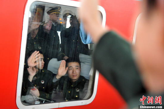 11月25日,在山西太原火車站,武警山西總隊(duì)2000余名退役士兵開始返鄉(xiāng)。圖為列車啟動(dòng)時(shí),這些大多年齡為“90后”的退伍老兵依依不舍的揮別昔日戰(zhàn)友。