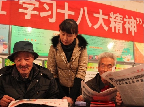 ????11月22日,一名輔導(dǎo)員在河北省永清縣后奕鎮(zhèn)董相莊村為村民講解十八大精神。日前,河北省廊坊市永清縣為宣傳貫徹十八大精神,通過選派輔導(dǎo)員、發(fā)放宣傳單等多種形式,在全縣386個村街中,掀起學習十八大精神的熱潮。新華社發(fā)(王曉 攝)