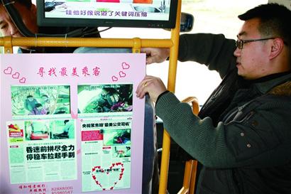 ????對于于會海想找熱心乘客的想法,他所在的車隊書記張青也非常贊同。張青告訴記者,于會海的事跡報道之后,車隊也一直借助媒體的力量尋找那些好心人,“紅衣大姐”褚鳳蘭就是乘客向車隊提供的線索。可是在褚鳳蘭之后,他們就再沒有接到其他3位愛心乘客的信息,為此車隊也很著急。在于會海病情穩(wěn)定出院后,車隊將尋找熱心乘客的工作也當作主要工作來做,他們向公交集團、巴士公司的領導匯報后決定利用211路公交車作為平臺,在車廂醒目位置設置一塊固定展板,宣傳于會海的事跡,同時通過這一車廂“微博”尋找另外3位熱心人。