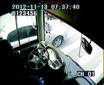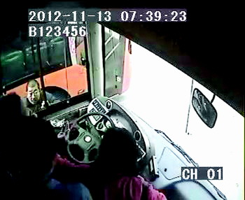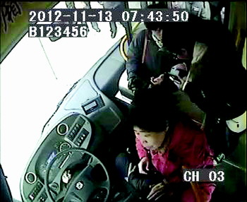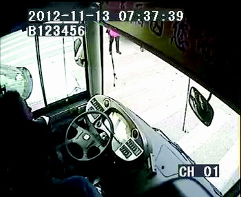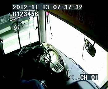 11月13日7時(shí)37分32秒,青島211路公交車剛從敦化路小學(xué)公交站駛出不足十余米,駕駛員于會(huì)海突然表情痛苦地低下頭,雙手緊緊撐在方向盤上,身體也開始有些不穩(wěn),緊接著他又趕緊挺直了身子,踩下剎車并用右手拉起了手剎。待車輛完全停穩(wěn)后,他整個(gè)人倚靠在駕駛座上,身上不斷地發(fā)抖。