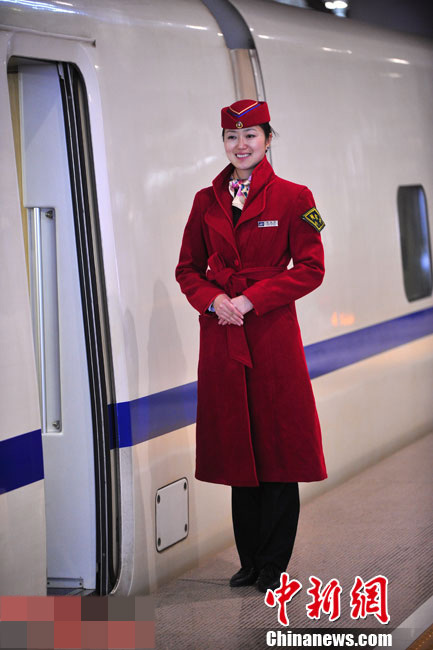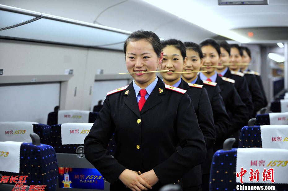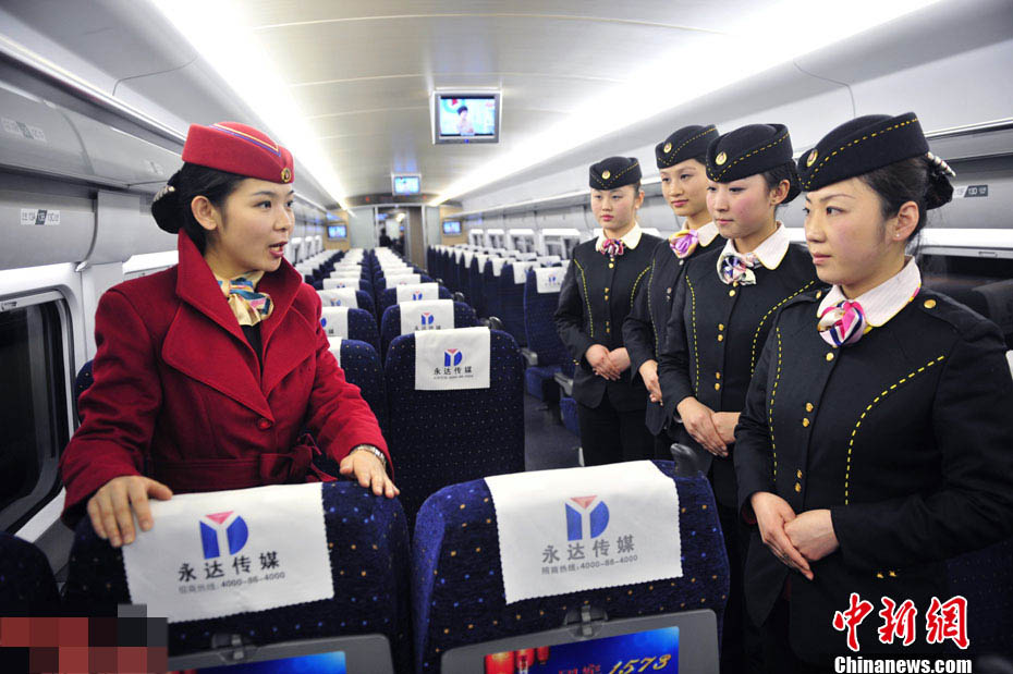 12月19日,西安客運(yùn)段的高鐵乘務(wù)員正在進(jìn)行服務(wù)技能訓(xùn)練。近日,西安鐵路局西安客運(yùn)段動(dòng)車隊(duì)對(duì)即將上崗的西安至北京高鐵乘務(wù)員進(jìn)行服務(wù)禮儀、安全作業(yè)等方面的強(qiáng)化培訓(xùn),為京廣高鐵正式開通運(yùn)營(yíng)做準(zhǔn)備。京廣高鐵北京至鄭州段將于12月26日開通運(yùn)營(yíng),鄭西高鐵同步調(diào)整列車運(yùn)行圖。屆時(shí),西安至北京將開行10對(duì)高鐵動(dòng)車組列車,最短運(yùn)行時(shí)間為4小時(shí)40分。(中新社發(fā) 唐振江 攝)