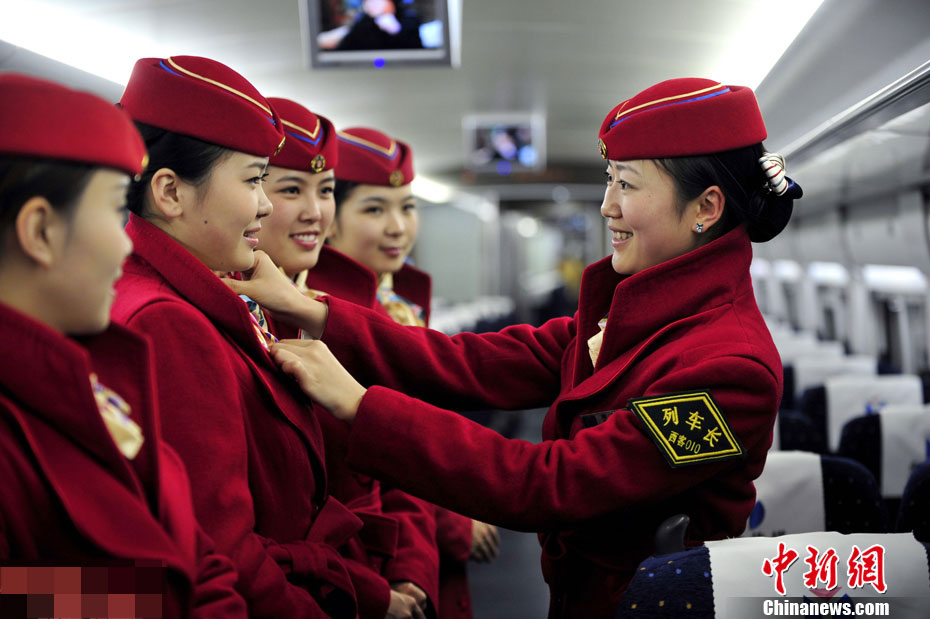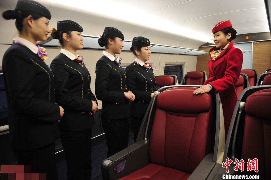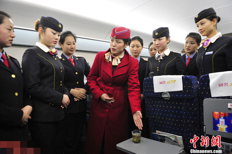 12月19日,西安客運(yùn)段的高鐵乘務(wù)員正在進(jìn)行服務(wù)技能訓(xùn)練。近日,西安鐵路局西安客運(yùn)段動車隊對即將上崗的西安至北京高鐵乘務(wù)員進(jìn)行服務(wù)禮儀、安全作業(yè)等方面的強(qiáng)化培訓(xùn),為京廣高鐵正式開通運(yùn)營做準(zhǔn)備。京廣高鐵北京至鄭州段將于12月26日開通運(yùn)營,鄭西高鐵同步調(diào)整列車運(yùn)行圖。屆時,西安至北京將開行10對高鐵動車組列車,最短運(yùn)行時間為4小時40分。(中新社發(fā) 唐振江 攝)