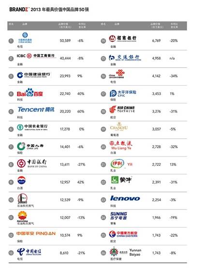 BrandZ?2013年最具價(jià)值中國品牌50強(qiáng)榜單(TOP1-26) ????此前,伊利先后登上福布斯2012年全球企業(yè)2000強(qiáng)排行榜和2012《財(cái)富》中國500強(qiáng)排行榜。8月8日,胡潤研究院發(fā)布了《2012胡潤品牌榜》,憑借科技創(chuàng)新等方面的持續(xù)投入以及奧運(yùn)效應(yīng)的逐步釋放,伊利較去年上升兩位,排名中國乳制品行業(yè)第一。 ????在品牌建設(shè)上,伊利結(jié)合傳統(tǒng)媒體與網(wǎng)絡(luò)媒體,向消費(fèi)者全方位傳達(dá)一種滿含情感的品牌信息。2012年奧運(yùn)會期間,車身上中文書寫的伊利logo和中國人獨(dú)特的東方面孔登陸紅色大巴,向世界展現(xiàn)平凡中國人的健康新形象和健康生活方式。通過國內(nèi)國外、線上線下的一系列互動(dòng)活動(dòng),伊利號召全國人民做自己的健康冠軍,進(jìn)而引起消費(fèi)者共鳴,提升國際知名度和品牌美譽(yù)度。隨著經(jīng)濟(jì)的發(fā)展和收入的增長,消費(fèi)者對品牌更加通曉,更有辨識力。今年的各種排名均顯示,品牌的構(gòu)建的對中國企業(yè)而言變得越來越重要。 ????自2005年開始,華通明略公司每年都會評估出BrandZ?最具價(jià)值全球品牌100強(qiáng),該榜單已成為國際公認(rèn)的權(quán)威品牌排行榜。在中國,BrandZ?品牌研究也已經(jīng)持續(xù)了十多年,積累了豐富的經(jīng)驗(yàn),今年已經(jīng)是最具價(jià)值中國品牌的第三次評選,伊利連續(xù)三年上榜50強(qiáng)。據(jù)了解,中國最具價(jià)值品牌50強(qiáng)采用了和全球最具價(jià)值品牌100強(qiáng)相同的計(jì)量方法。BrandZ ?品牌估值法是根據(jù)WPP每年出資開展的消費(fèi)者市場調(diào)查來判定品牌對購買決策所產(chǎn)生的影響,還綜合分析了來自Bloomberg和KantarWorldpanel等其他資料的財(cái)務(wù)信息,并以美元來體現(xiàn)品牌估值。盡管中國經(jīng)濟(jì)持續(xù)低迷,伊利去年品牌價(jià)值24億美元,今年27億美元,表現(xiàn)出穩(wěn)健的增長態(tài)勢。 |