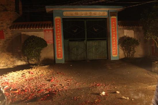 2013年1月15日,湖南省婁底市新化縣發(fā)生一起校園慘案,一名校長(zhǎng)遇難,一名學(xué)生受傷正在搶救之中。15日下午13點(diǎn)50分許,一男一女闖入該縣上梅鎮(zhèn)北渡中心小學(xué),男子用兇器將一名三年級(jí)學(xué)生打傷,該校校長(zhǎng)在阻攔其行兇時(shí)被砍傷致死。圖為當(dāng)天晚上,新化縣上梅鎮(zhèn)北渡中心小學(xué)校門緊閉,地上有鞭炮痕跡。