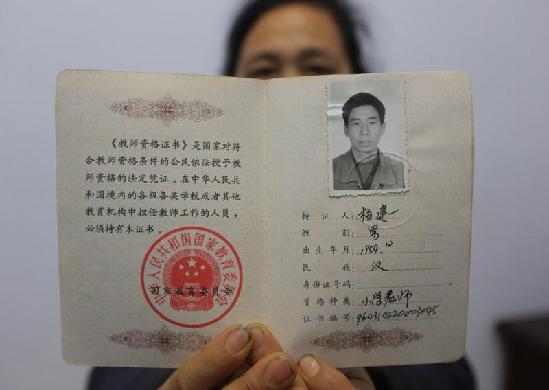 2013年1月15日,湖南省婁底市新化縣上梅鎮(zhèn)北渡中心小學(xué)因保護(hù)學(xué)生遇難的校長(zhǎng)楊建一生前教師資格證書。