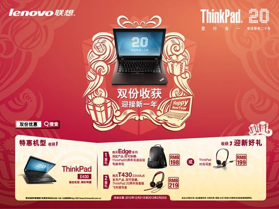 ????手中的筆記本已經(jīng)風(fēng)燭殘年,運(yùn)行速度慢得讓你無(wú)法忍受?鍵盤(pán)沒(méi)手感,電池不給力,散熱還悲劇,辛苦打拼了一整年的你是否迫切地想換掉手中的“老爺機(jī)”?忍過(guò)了“雙十一”,撐過(guò)了“世界末日”,緊捂荷包遲遲不出手的你難道是在等待它的消息?徘徊各大賣(mài)場(chǎng)猶豫不決只因?yàn)槿鄙僖粋€(gè)非買(mǎi)不可的理由? ????現(xiàn)在是時(shí)候出手了!自2012年12月21日起至2013年2月25日,聯(lián)想ThinkPad將針對(duì)旗下多款重磅機(jī)型展開(kāi)主題為“年末特惠雙份收獲”的年底促銷(xiāo)活動(dòng)。無(wú)論是年輕時(shí)尚的Edge系列、傳承經(jīng)典的T系列筆記本、還是代表專業(yè)魅力的S系列筆記本,只要購(gòu)買(mǎi)促銷(xiāo)指定機(jī)型,即可得到超值限量好禮,為你的新年帶來(lái)雙份收獲,雙份驚喜!