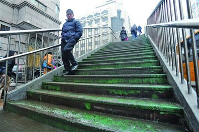 ????據(jù)李女士反映,她所開的服裝店就在離威海路天橋不遠(yuǎn)的地方,每當(dāng)下雪天到來,她便經(jīng)常能看到橋上有人滑倒?!白蛱焱砩虾跓粝够鸬?,一個老人拄著拐棍上的天橋,還沒走上臺階呢,就給滑倒了,坐在地上很長時間都起不來?!崩钆空f道。接到李女士的電話,記者來到威海路附近的過街天橋處,此時天橋處的許多臺階仍然被雪覆蓋著,一些積雪較厚的地方長時間被踩踏,已經(jīng)很結(jié)實地貼在臺階上,通過此處的行人需要緊抓住旁邊的扶手,小心翼翼地走上臺階。對于一些年邁的老人來說,在這種天氣下通過天橋就顯得格外困難。一些老人僅上臺階往往就要花上5分鐘。