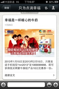 可以說,通過隨處可見、隨處可拍的二維碼,蒙牛乳業(yè)在春節(jié)期間所傳遞的“點(diǎn)滴幸?!罢嬲饬x上能在每個(gè)人的身邊“此刻發(fā)生”,在體驗(yàn)濃濃親情的同時(shí),更能感受春節(jié)促銷帶來的超值體驗(yàn)。這個(gè)溫情洋溢的冬季,讓我們一起拿起手機(jī)、捕捉隨處可見的“點(diǎn)滴幸?!保尪S碼這樣一個(gè)洋溢愛的符號(hào),轉(zhuǎn)動(dòng)每個(gè)人的親情體驗(yàn)吧!~