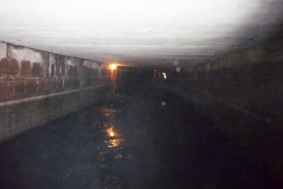 ????排水管道內(nèi)部漆黑一片,用閃光燈勉強照亮,寬度可容跑車