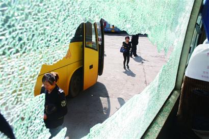 ????接到線索后,記者趕到了利津路客運站,此時3輛被擊傷的公交車全部停在停車位上等待警察前來調(diào)查。記者發(fā)現(xiàn)停在兩側(cè)的車中間一塊玻璃完全破碎,碎玻璃碴被擊碎后飛向車內(nèi),車座子和過道上滿是碎玻璃碴,萬幸的是當時兩輛車的窗戶邊沒有乘客。中間一輛車是車玻璃的邊緣部分被擊中,玻璃碎成兩截。對于這種結(jié)果,該車司機喬先生連連表示這是不幸中的萬幸?!碑敃r這玻璃后面坐著一對母子,當時孩子就嚇哭了,要是擊中中央位置,碎玻璃飛到孩子臉上后果不堪設想。”喬先生氣憤地說。