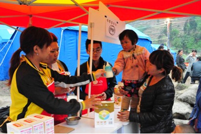 ????圖為一位母親帶著寶寶來到母嬰服務(wù)區(qū)接過工作人員手中沖泡好的奶粉,這是地震后孩子喝到的第一口牛奶。 |