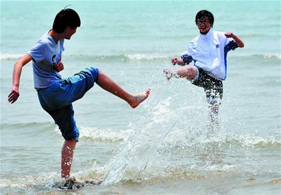 氣溫大幅上升,也讓市民換上了靚麗的夏裝。海邊沙灘上也出現(xiàn)了裙裝女游客和赤腳下海的孩子們。
