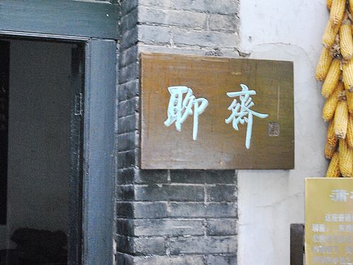 ????順著蜿蜿蜒蜒的石板路來(lái)到蒲松齡故居,一座具有典型北方農(nóng)家院落風(fēng)格的故居。院子內(nèi)三棵古槐盤(pán)根錯(cuò)節(jié)聳立路邊,蔭翳天日,一下子把人帶進(jìn)《聊齋志異》的情境之中,天空中飄灑的淅瀝小雨也更添了幾分神秘氛圍。故居正房為磚石、土坯結(jié)構(gòu)的普通民房,木欞門(mén)窗,房?jī)?nèi)路大荒手書(shū)的“聊齋”匾額迎門(mén)高懸,匾下懸掛著蒲松齡的照片。