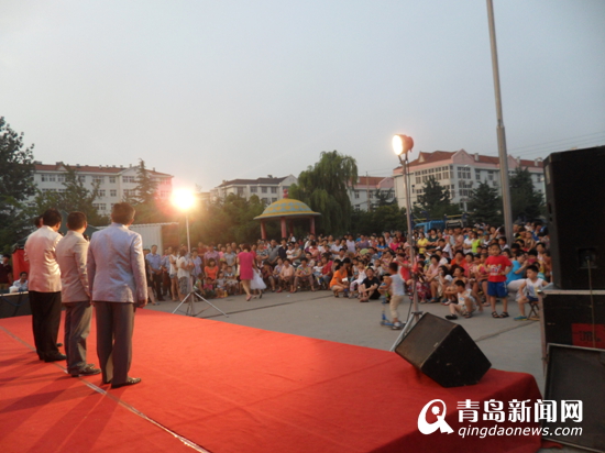 ????不到7點(diǎn),文化廣場(chǎng)的舞臺(tái)剛搭起來,臺(tái)下已經(jīng)座無虛席,居民們搖著蒲扇,拿著自家的馬扎,領(lǐng)著自家的孩子,將舞臺(tái)圍的水泄不通?!奥犝f今天是青島劇院的演出,以前在電視上看到在別的社區(qū)演過,今天能在自己家門口看到,當(dāng)然不能錯(cuò)過了?!币晃恍諒埖拇髬寭尩搅饲芭诺奈恢?,高興的說。