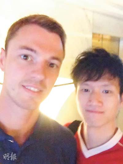 ????曼聯(lián)迷阿杰(右)本月中跟隨曼聯(lián)到泰國并入住同一酒店,成功在升降機(jī)大堂與曼聯(lián)年輕后衛(wèi)伊云斯(左)合照。(受訪者提供)