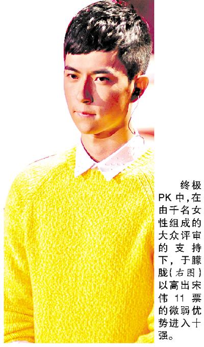 前晚,快男十強(qiáng)誕生戰(zhàn)的第一場(chǎng)中,最后進(jìn)入終極PK環(huán)節(jié)的是于朦朧和宋偉,在史上首支由千名女性組成的大眾評(píng)審的支持下,前者以高出對(duì)方僅11票的微弱優(yōu)勢(shì)而拿到一個(gè)十強(qiáng)席位。這一結(jié)果在網(wǎng)上引起不小風(fēng)波,許多粉絲直言有黑幕:“宋偉明顯唱得比他好,憑什么他進(jìn)了?”