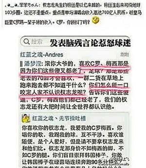 事情原由是這樣的。7月28日晚8點左右,韓國明星權(quán)志龍(G-Dragon)的百度貼吧遭遇足球球迷“爆吧”,導(dǎo)火索是一位自稱是權(quán)志龍粉絲的微博用戶“潘夢瑩”,發(fā)布了關(guān)于對C羅、梅西等球星的過激言論。根據(jù)網(wǎng)友截圖,該女粉絲口出狂言“挑釁”足球運動:“龍龍(權(quán)志龍)的一場演唱會夠C羅踢一輩子足球了!……喜歡C羅、梅西是因為你們這些傻X都老了,足球是那些老去的‘70后’才喜歡,一群‘二貨’在草地上跑來跑去都不知道干什么呢!”隨后,該言論截圖更被轉(zhuǎn)帖至百度“足球吧”,掀起了權(quán)志龍粉絲與球迷之間的罵戰(zhàn)。