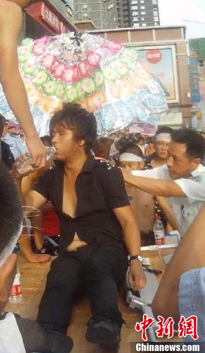 8月3日下午3點多,在湖北武漢中山大道佳麗廣場,十多名赤膊男子披麻戴孝,用門板抬著一具“尸體”示威,宣稱城管打死人了。而記者了解后得知,這其實是因為小販不滿城管執(zhí)法方式,策劃的一出鬧劇。“死者”在佳麗廣場側(cè)面躺了數(shù)小時后,因耐不住天氣炎熱“復(fù)活”逃跑。目前,警方已經(jīng)控制4名鬧事者,詐死男子在逃。