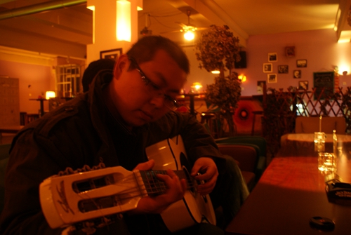 休息的時(shí)候傅忠輝在靜吧里寫寫小說,玩玩吉他