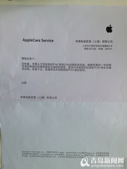 ??? 青島新聞網(wǎng)訊 青島市民孫先生反映,自己去年時在某網(wǎng)上商城購買的newipad,經(jīng)過不到一年的使用突然無法開機(jī),找到蘋果售后保修,對方稱該機(jī)器在送修前有過未經(jīng)蘋果授權(quán)的維修,結(jié)果不能為其產(chǎn)品保修,那么,這樣的情況該如何處理呢。記者對此事進(jìn)行了采訪。