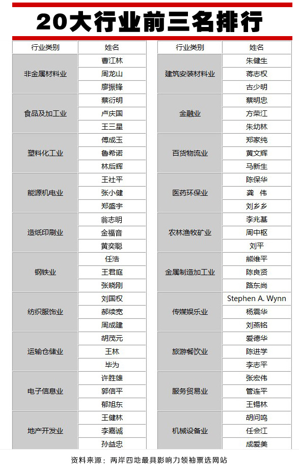 ????“票選兩岸四地最具影響力領(lǐng)袖”活動,規(guī)模之大、候選人之多、規(guī)格之高前所未見,一萬名候選人要選出6,000人,看來好像不少,但因分屬20個行業(yè),平均每個行業(yè)入選者只有300人,讓競爭更加火熱。
