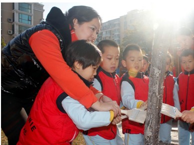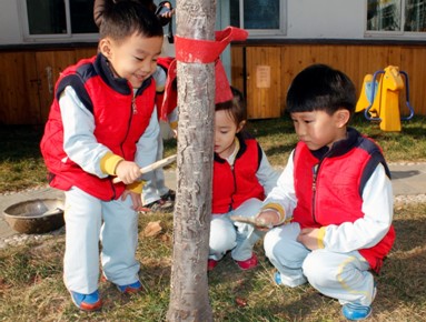 小朋友們得意洋洋的看著自己的勞動(dòng)成果,意猶未盡的回到教室。這時(shí)老師說(shuō):“第一階段圓滿(mǎn)完成嘍!大家不要忘記過(guò)幾天石灰水干了以后,我們還要為小樹(shù)裹上厚厚的稻草呢!”“好!”孩子們響亮地回答。