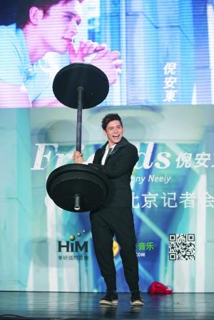 減肥成功的倪安東在發(fā)布會(huì)上賣(mài)萌表演“拳擊”和“舉重”動(dòng)作。