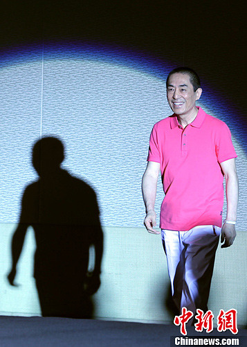 ????圖為張藝謀穿粉紅色亮眼T恤登臺。中新社發(fā) 李學(xué)仕 攝??