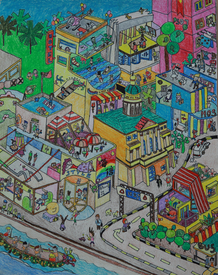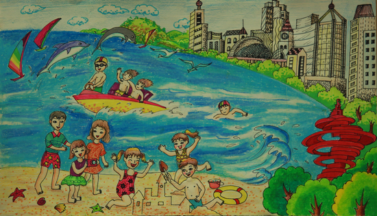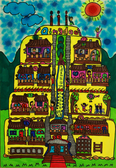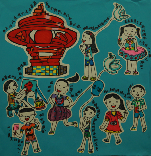 ??? 記者在現(xiàn)場看到,參賽作品緊密結(jié)合“中國夢·幸福青島”主題,用稚嫩的筆觸,對孩子們心目中的“青島”、“幸福”、“夢想”做了獨特詮釋。許多作品很好的結(jié)合了青島的風(fēng)光、人文,甚至熱門話題事件。其中,青島啤酒、帆船之都、五月的風(fēng)、老街、天主教堂,成為許多作品里出現(xiàn)的意象,但描繪方式極其豐富多樣,表現(xiàn)出孩子們濃濃的童趣和天馬行空的想象力。
