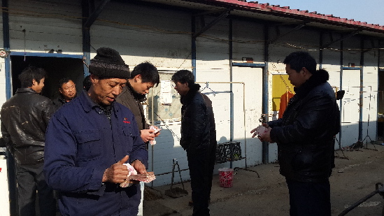 ????“‘足額發(fā)放工資,讓農(nóng)民工兄弟過個好年’,是項目部領(lǐng)導(dǎo)元旦那天來看望我們時說的。領(lǐng)導(dǎo)的話聽著舒服,事也辦的漂亮,我們當然高興啦!”陳志勇身旁的王金兵抖著手里的工資,笑嘻嘻地補充說。