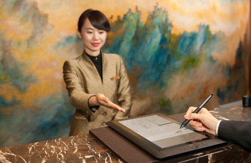 ????青島香格里拉大酒店于引入了無(wú)紙化入住和離店辦理系統(tǒng),成為青島市首家提供無(wú)紙化登記服務(wù)的酒店。無(wú)紙化登記服務(wù)使用可全面代替?zhèn)鹘y(tǒng)型入住和離店的服務(wù)過(guò)程。賓客僅需通過(guò)智能手寫板即可查看顯示屏,核對(duì)個(gè)人資料及賬單信息,用電子筆于手寫板上簽字確認(rèn)后,帳單便會(huì)以電子郵件的形式發(fā)送至賓客的郵箱。以酒店696間客房過(guò)去一年的用紙量來(lái)推算,僅入住及辦理退房方面每年就可節(jié)省近40萬(wàn)張A4紙,極大地推行了低碳辦公。