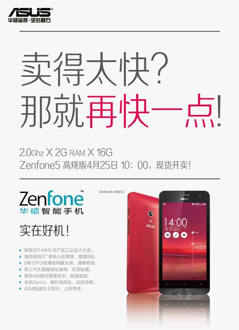 ????華碩ZenFone智能手機(jī)4月11日正式發(fā)布以來,上市不到一周,便以奢華的設(shè)計和性能、以及親民價格引發(fā)了消費(fèi)者的強(qiáng)烈關(guān)注和搶購。4月25日,華碩ZenFone智能手機(jī)再次全面來襲,999元即可買到主頻2.0GHz,2GB內(nèi)存,16GB海量存儲的高規(guī)格配置,擁有千元智能手機(jī)的旗艦性能!4月25日易迅當(dāng)日現(xiàn)貨發(fā)售,親愛的小伙伴,你們準(zhǔn)備好了嗎?