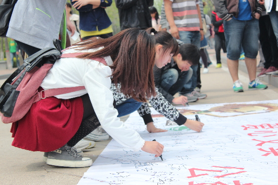 ????活動(dòng)當(dāng)天,春暉志愿服務(wù)隊(duì)在學(xué)校玉蘭西門、薈萃西門、唐島灣東門三地同時(shí)進(jìn)行了公益義賣與環(huán)保宣傳?,F(xiàn)場吸引了眾多師生前來參與,他們紛紛在橫幅上簽上了自己的名字表達(dá)決心。????