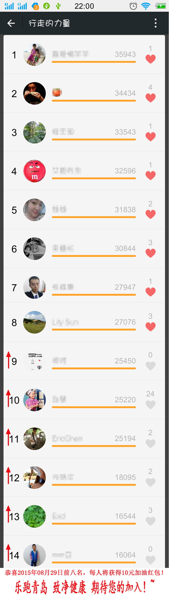 ????活動行至于此,已經(jīng)到了第19天,活動參與便收獲了不少“愛跑一族”的歡迎,而每天10元的“加油紅包”也已安心送至前八強的口袋中,具體參與情況如下: