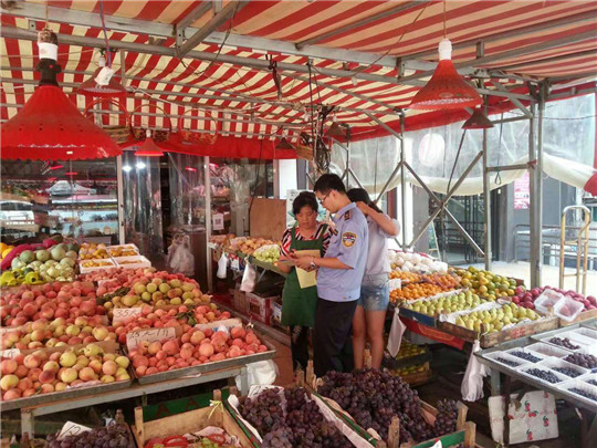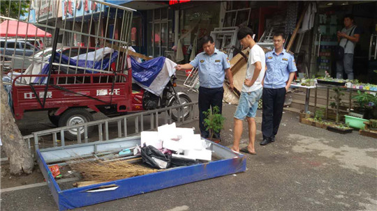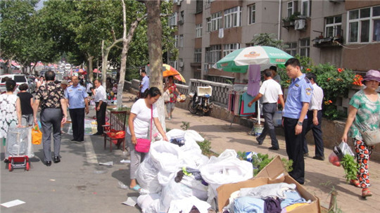 ????便民市場(chǎng)設(shè)置極大地方便了居民,但是市場(chǎng)冒市、暴市導(dǎo)致的臟亂差堵卻擾民不淺,也是執(zhí)法之重點(diǎn)。7月27至29日,寧夏路中隊(duì)一直在清理整治鎮(zhèn)江路市場(chǎng)和膠寧高架橋底市場(chǎng),共規(guī)范商戶26家,規(guī)范門頭10家,清理游商浮販24人次,兼顧拆除橫幅兩條;7月20日以來(lái),洛陽(yáng)路中隊(duì)一直派出執(zhí)法人員,以守崗和巡查相結(jié)合,持續(xù)清理開(kāi)平路早市,使得市場(chǎng)周邊秩序大為改觀;7月26日至29日,敦化路中隊(duì)每天出動(dòng)2車8人,分2次清理整治撫順路批發(fā)市場(chǎng),規(guī)范門頭占路經(jīng)營(yíng)30余處,新疆少數(shù)民族搭棚賣棗6處,暫扣帳蓬3個(gè),廣告燈箱8個(gè);大港中隊(duì)規(guī)范轄區(qū)舊貨市場(chǎng),整治占路經(jīng)營(yíng)30處,暫扣桌椅等12個(gè),拆除地鎖6個(gè),方便了路人行走。