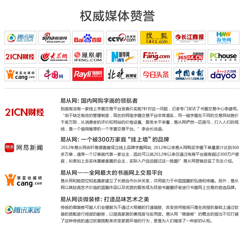 有人說,國內(nèi)藝術(shù)品投資市場潛力很大,而傳統(tǒng)的藝術(shù)品交易存在渠道缺乏,信息不對稱等等問題。導(dǎo)致一部分的投資者與藝術(shù)品投資無緣,而在今年易從網(wǎng)則讓這部分人參與到藝術(shù)品投資中來,易從網(wǎng)簽約實力當(dāng)代名家,“零門檻”運用互聯(lián)網(wǎng)的便捷、透明,終身保真,來進行藝術(shù)品的收藏投資,并以優(yōu)惠超低的價格出售。易從網(wǎng)成立到現(xiàn)在已有300萬網(wǎng)友選擇,多家權(quán)威媒體追蹤報道!