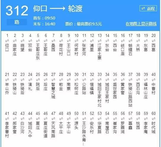 ????312路公交車單程68.9公里,全程102個(gè)站點(diǎn),每天只發(fā)兩班車。