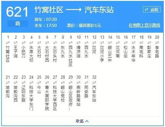 ????青島621路上行是從青島竹窩社區(qū)出發(fā),到青島汽車東站的分段計(jì)價(jià)有人售票線路。途中共經(jīng)過(guò)竹窩社區(qū),王子澗,小把刀,水庫(kù)大壩,大石村等32個(gè)站點(diǎn)。