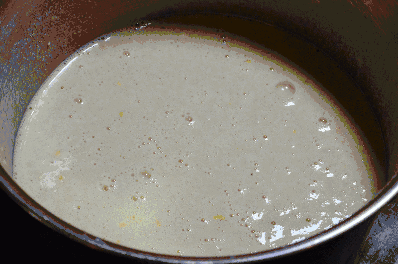 5、將蕎麥粉,面粉混合,加入雞蛋拌勻,再分三次加入水?dāng)嚢杈鶆蛑瞥擅鏉{。不粘鍋上火燒熱,加入蕎麥面漿烙成薄餅。