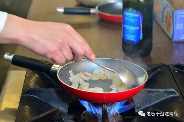 3、鍋中加入橄欖油燒熱,入蝦肉炒至半熟,再入蒜蓉炒香。