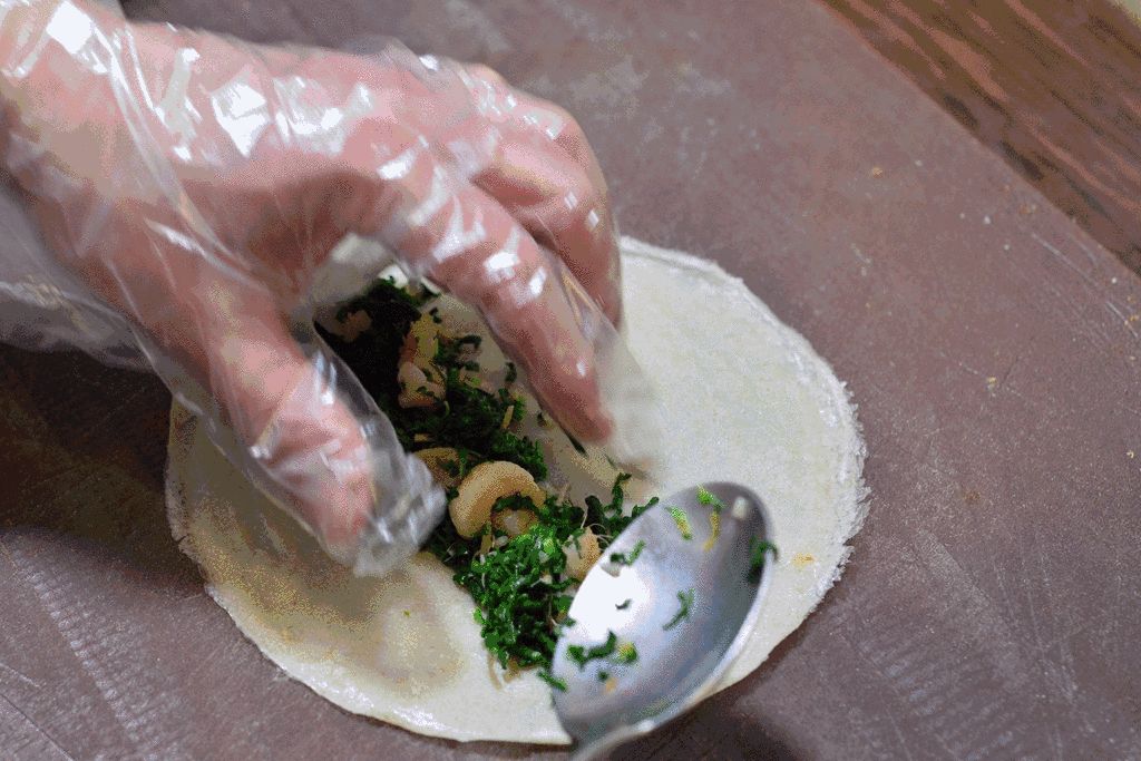 6、將調(diào)好的鮮蝦薺菜餡卷入蕎麥餅中。