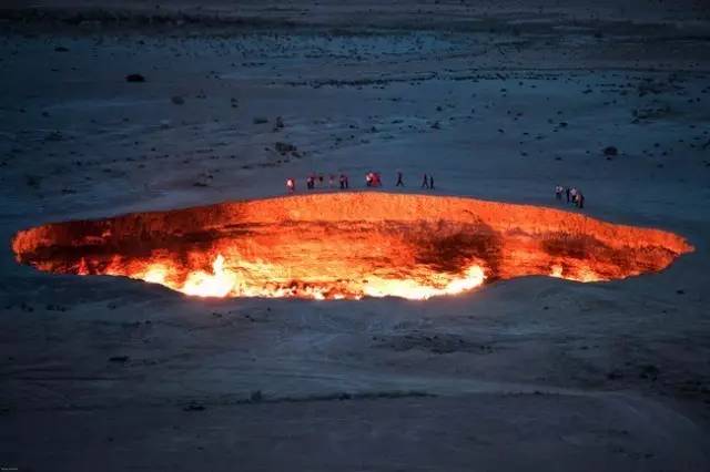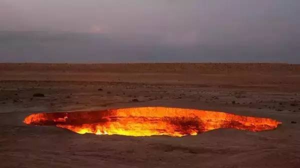 1971年蘇聯地質學家在中東土庫曼斯坦的卡拉庫姆大沙漠中部,人為原因形成了這個直徑約70米的大坑,坑內燃燒的大火40多年從未熄滅。