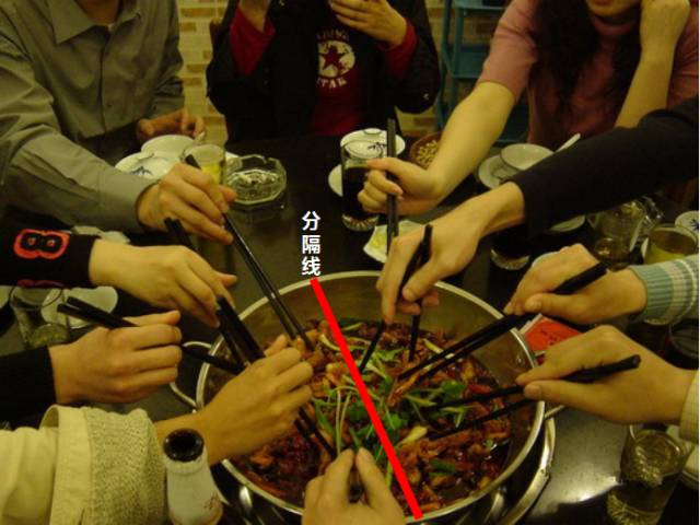 9、夾菜不“過河”,夾菜不過盤中線,夾靠近自己這邊的菜,盡量不要翻亂了別人那一邊的,這是禮貌。