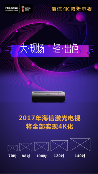 ????2017年4月26日,隨著全球首款88吋DLP超短焦4K激光電視上市發(fā)布,海信已經(jīng)推出88吋、100吋、120吋4K激光電視陣容,而未來,該尺寸還將覆蓋至70吋、140吋,隨著產(chǎn)品線不斷完善,海信正在為“攪局”傳統(tǒng)電視大屏市場積蓄勢能。