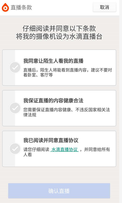 ????第三 直播協(xié)議已經(jīng)明文公示在水滴平臺(tái)官網(wǎng),如:“請保證您是自愿公開攝像機(jī),攝像機(jī)所拍攝的內(nèi)容無任何您或他人的個(gè)人隱私,并確保拍攝內(nèi)容健康,不觸犯法律”等相關(guān)隱私保護(hù)內(nèi)容。